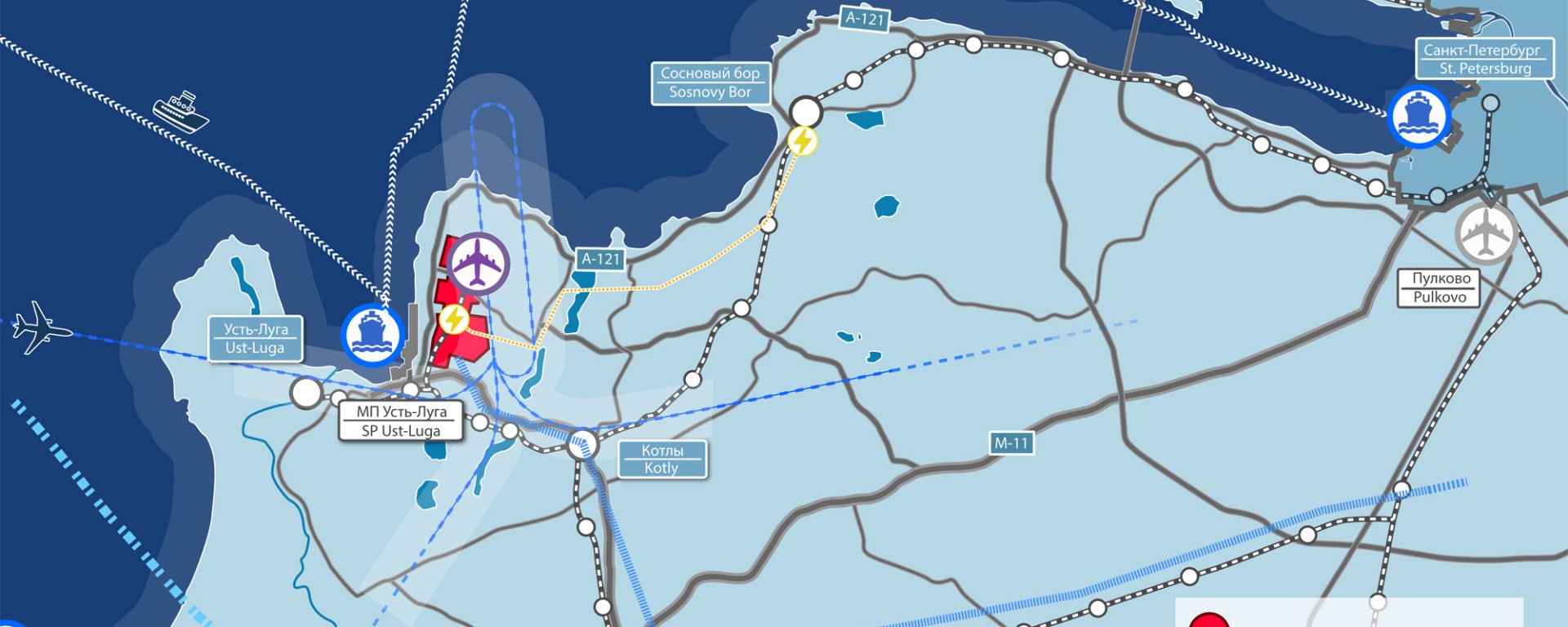 De exemplu, Moscova construiește Complexul Multimodal Ust-Luga, în Golful Finlandei, și dezvoltă terminale la Portul Comercial Ust-Luga. Anul acesta, portul de la Ust-Luga a fost cel mai mare din Marea Baltică după intrările de marfuri și al doilea ca mărime din Rusia (după Novorossiysk, situat la Marea Neagră). Unele estimări rusești sugerează că va fi, în cele din urmă, cel mai mare din lume. În următorii câțiva ani, Rusia va finaliza ambițiosul terminal Lugaport din portul Ust-Luga, care va crește cifra de afaceri cu aproximativ 30% – inclusiv cea mai mare parte a ceea ce Rusia trimite acum în porturile din statele baltice. Moscova a semnat, în 2019, un acord cu China National Chemical Engineering pentru a construi instalații petrochimice și în Ust-Luga, o rotiță în mai grandioaasa Inițiativă Belt and Road, în valoare de aproximativ 13,3 miliarde de dolari, potrivit Xinhua.