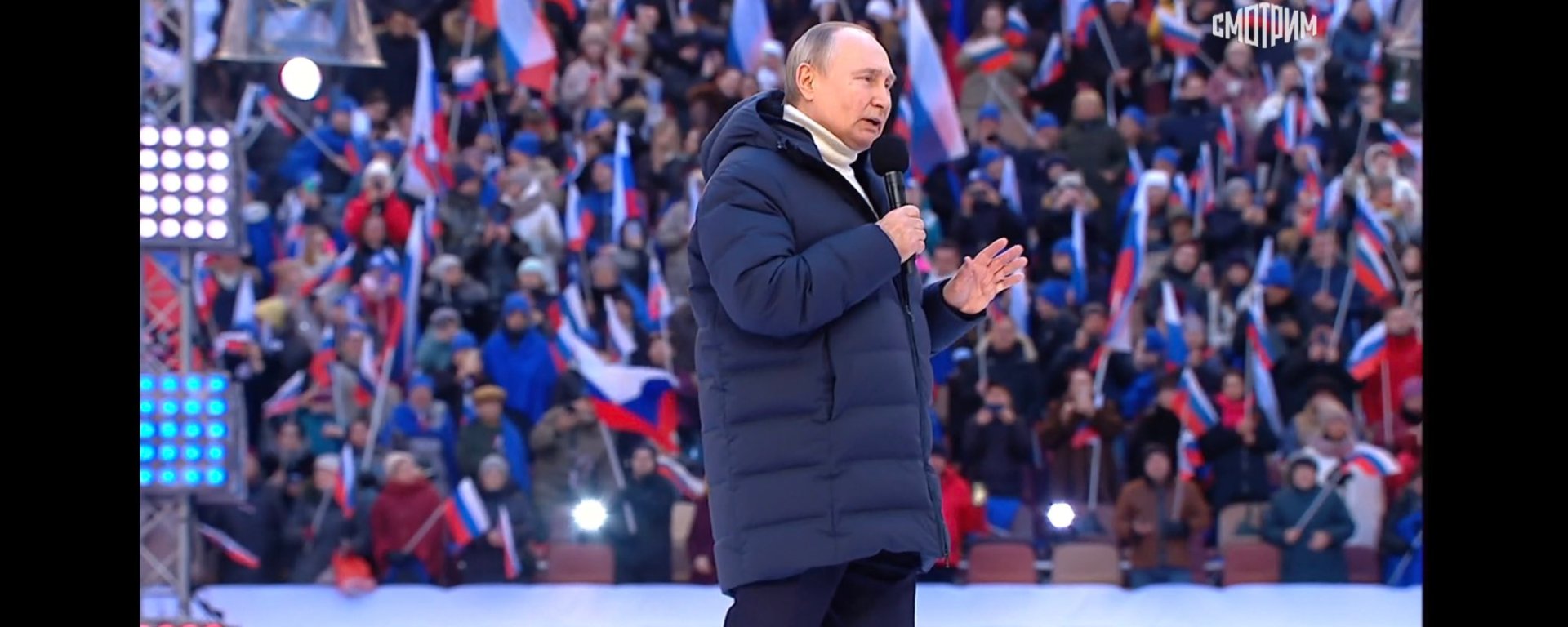 Putin era pe cale să laude eroismul militarilor ruşi angajaţi în lupte în Ucraina, în faţa a zeci de mii de persoane, pe stadionul Lujniki, moment în care televiziunea publică rusă Rossiya-24 a început să difuzeze alte momente de la acest eveniment, discursuri oficiale şi cntece populare.