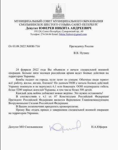 La începutul lunii septembrie, deputații districtului municipal „Smolninskoe, din Sankt Petersburg, s-au adresat Dumei de Stat cu o propunere de demitere a lui Vladimir Putin. Pe lângă asta, îl acuză pe președintele rus de trădare pentru războiul declanșat din Ucraina. În decurs de o săptămână, deputații au fost acuzați de „discreditarea armatei” și amendați, iar instanța a demarat procedura de dizolvare a consiliului municipal (pe motiv că deputații nu ar fi ținut ședințe). Meduza a discutat cu unul dintre inițiatorii apelului, deputatul municipal Nikita Iuferev (foto), despre modul în care politicienii din Sankt Petersburg au decis să demareze această acțiune în ciuda amenințării directe cu urmărirea penală.