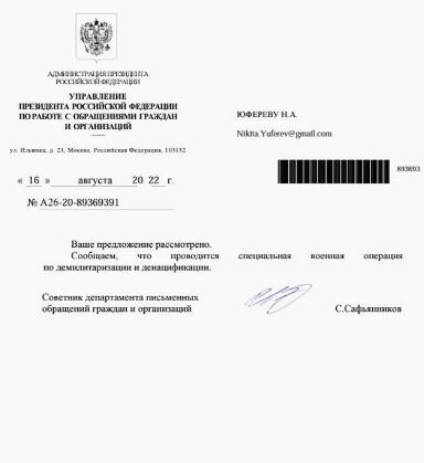 Apoi au apărut statistici cum că milioane de oameni părăsiseră deja Ucraina, că moartea a mii de civili fusese deja documentată și că printre aceștia se aflau sute de copii. Am expus aceste statistici într-o scrisoare și i-am trimis-o lui Putin – cerându-i să dea ordin de încheiere, din motive umanitare, a „operațiunii militare”. La această scrisoare de la administrația prezidențială am primit răspuns: „Propunerea dumneavoastră este examinată”.