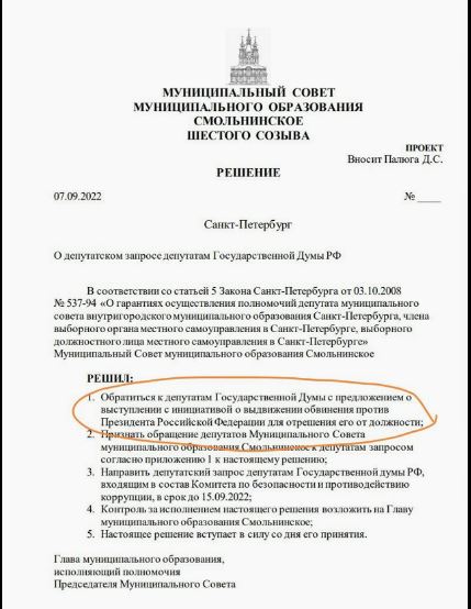 La o întâlnire [a deputaților de Smolninskoe] din 7 septembrie, deputatul Dmitri Paliuga a sugerat să se îndrepte nu către Putin, ci către Duma de Stat, cu un apel la demiterea președintelui. Ca bază, am invocat trădarea – în opinia noastră, se potrivește cu cazul actualului președinte. Am scris că Vladimir Putin reprezintă o amenințare la adresa securității Rusiei și a cetățenilor săi. Totodată, am programat inițial o altă ședință, pentru 7 septembrie, unde trebuia să rezolvăm probleme legate de trecerile de pietoni. Dar uneori trebuie vorbit și pe agenda federală – nu există nimeni altcineva să o facă.